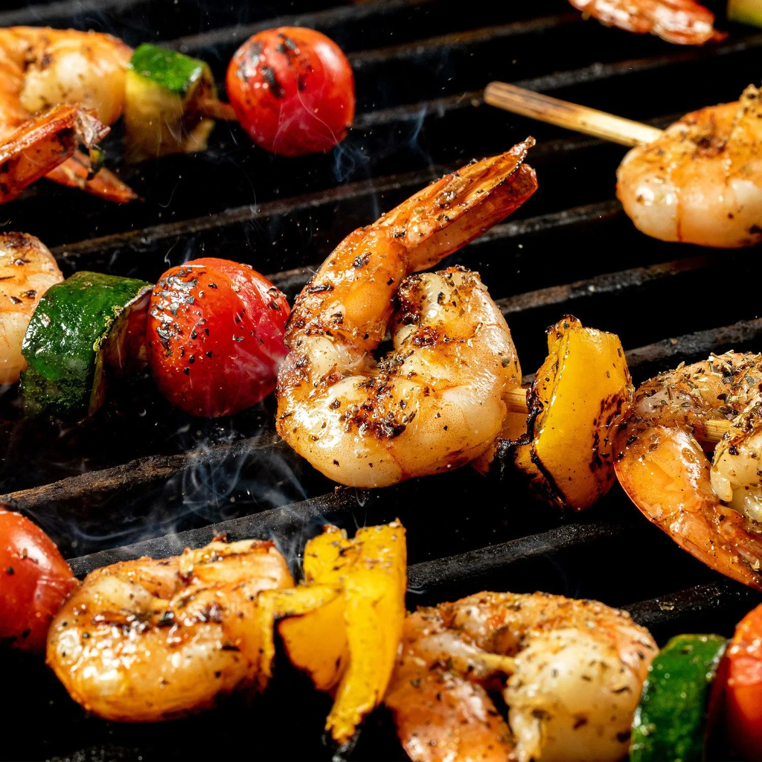 Bring a platter of grilled shrimp and vegetable skewers to the table when you’re entertaining this summer. They’re easy to assemble, and they look and taste great.